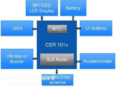 基础智慧手表的主要元件包括一个Bluetooth Smart晶片、一个微控制器以及一个液晶显示萤幕。例如:CSR μEnergy CSR101x系列设备平台可提供一个单模蓝牙低功耗射频晶片、一个16位元整合处理器与128KB记忆体,它是整个系统的核心,同时控制所有周边设备。液晶显示萤幕用于向用户显示资讯,而且一般都具备电容/电阻式触控功能,因此无需设计实体按键。液晶显示萤幕的触控功能大幅提升了用户体验,只需透过简单的触控、点选及滑动,便可操控手表上的各种应用程式。微控制器经由I 2 C或SPI等串列汇流排与液晶显示萤幕进行通讯。此外,智慧手表还可设置扬声器或压电式鸣蜂器,因而提供闹铃等提醒功能。