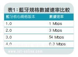 表1比较所有蓝牙核心规格版本的数据速率。蓝牙技术联盟推出的蓝牙4.0(现商标更名为Bluetooth Smart)使物联网的实现成为可能,因而将数十亿需求较长电池寿命的家电、设备及机器成功导入互连世界。创造智慧手表应用