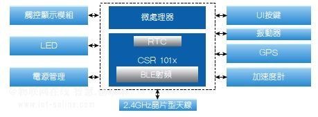 图3展示如何透过整合一个微处理器创造出可扩充的平台。微处理器可提供增强的处理能力以及扩展的I/O埠,因而支援在产品设计中设置更多感测器(如气压感测器),以及周边设备(如具备定位功能的GPS);同时,透过整合微处理器,该解决方案可执行更复杂的数据处理演算法,还可使用具备大量绘图介面的作业系统。微控制器透过串列汇流排利用简单标准的控制协议与CSR101 x设备进行通讯。