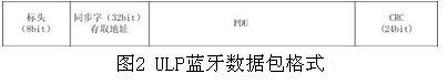 ULP蓝牙使用两种类型的地址:设备地址和存取地址,设备地址细分为公有和私有设备地址。每个ULP设备应该分配一个固定48bit的ULP蓝牙公共设备地址,而私有设备设置的地址是可选的。一个ULP设备只有在证明设备可靠性后,才显示其私有地址。每个链路层的连接有一个伪随机32bit的存取地址,由连接中的申请者产生,每个链路层连接有不同的存取地址。ULP蓝牙系统中,只能有一个数据包格式能在广播通道数据包和数据通道数据包中同时使用。如图2所示,每个数据包含4个实体:标头,同步字,PDU,和CRC。广播数据包中的同步字是固定的,数据通道中的数据包同步字是链路层连接的存取地址。
