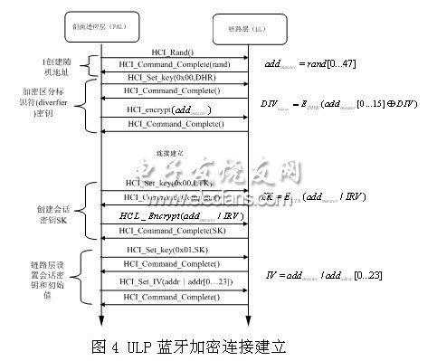 链路层设置会话密钥和初始值:分别发送命令HCI_Set_key(0x01,SK)和HCI_Set_IV(addr|addr[0…23])到链路层设置,返回完成设置命令HCI_Command_Complete()。