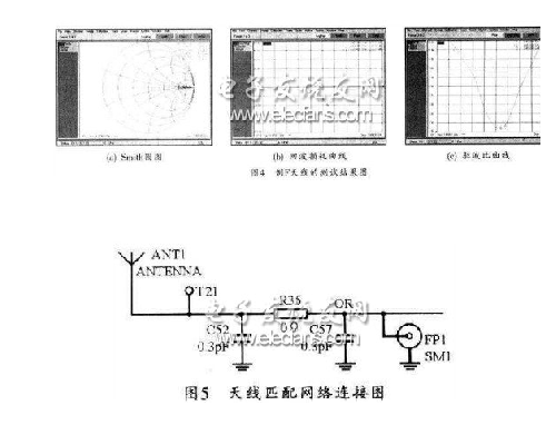 为了方便测量,可将一特性阻抗为50 Ω的同轴电缆的内导体焊接在与天线馈电点相连的50 Ω微带线上,而将外导体就近接在蓝牙模块的地上,同时在同轴电缆的另一端焊SMA接头并连到Agilent网络分析仪N3382A。这样,通过网络分析仪测得的Smith圆图可知,经过匹配网络后的天线阻抗非常接近50 Ω。回损10 dB时的带宽约为90 MHz,可完全覆盖蓝牙所工作的ISM频段(2.400~2.483 GHz),且其驻波比小于2,可以满足蓝牙无线电技术的要求。图4所示是倒F型蓝牙天线的测试结果图。图5给出了其天线匹配网络的连接示意图。